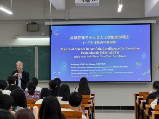 宣讲会伊始,我院许国良副书记对江绍祥教授一行表示热烈的欢迎,并向参会的同学们详细介绍了江绍祥教授。许国良表示,为回应我院学子对研究生深造的更高需求与期待,学院特邀请香港教育大学江绍祥教授莅临我院,举办人工智能硕士项目招生宣讲会。本次宣讲旨在为同学们提供精准升学指导,解答备考疑惑,明晰职业规划。随后主讲人江绍祥教授围绕香港教育大学研究生核心专业的培养优势作了详细的介绍,并表示专业聚焦人工智能领域,课程涵盖人工智能基础、技术与工程等核心内容,还有数据科学等选修方向,能让同学们深入学习前沿知识与技能。宣讲会上香港教育大学上同时向参会同学发放了人工智能硕士招生手册,方便同学们更加深入了解。宣讲会结束后,一些同学留下来和江绍祥进行了交流,江绍祥热情为她们提出的问题作了详尽的解答。